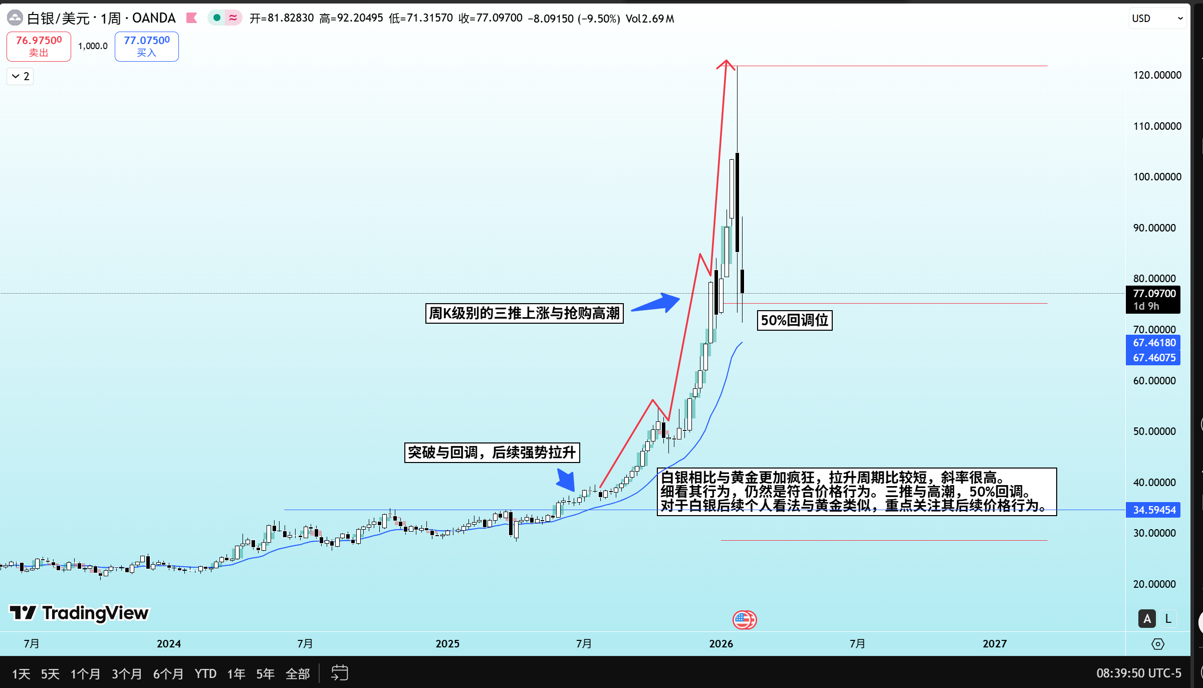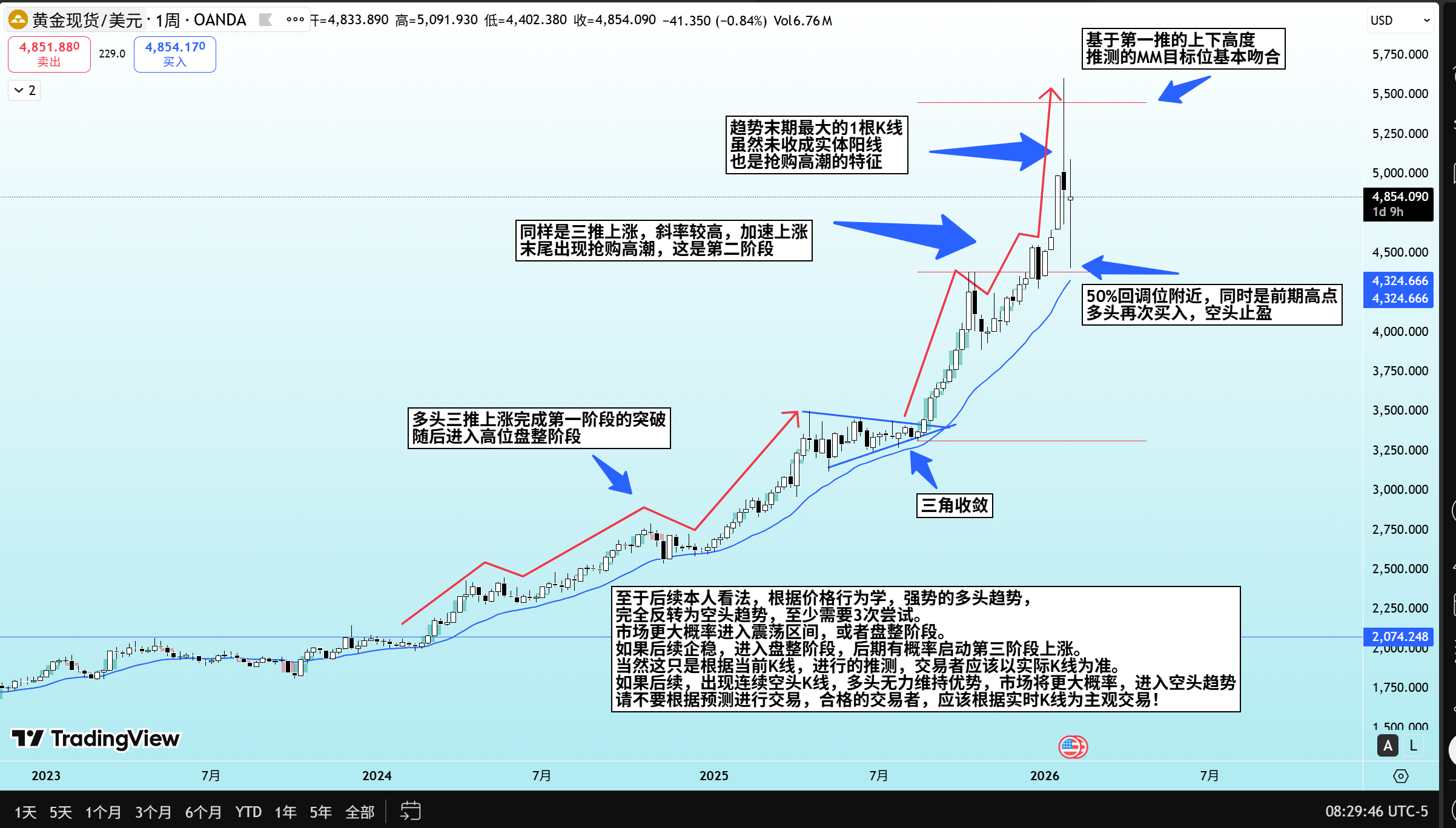 如图所示!2024年3月4号黄金突破了盘整长达1288天的区间震荡,随后开启了3个阶段的涨势。第一段拉升区间盘整,随后开启第二段拉升,盘整过后,开启最后一段拉升,明显在后期图中我们能看到,最后2根周K异常的大,这是加速上涨,多头用尽最后的力量达到目标位。后续看到价格在高位盘整。这是一次教科书级别的上涨,突破,三段拉升,加速上涨。