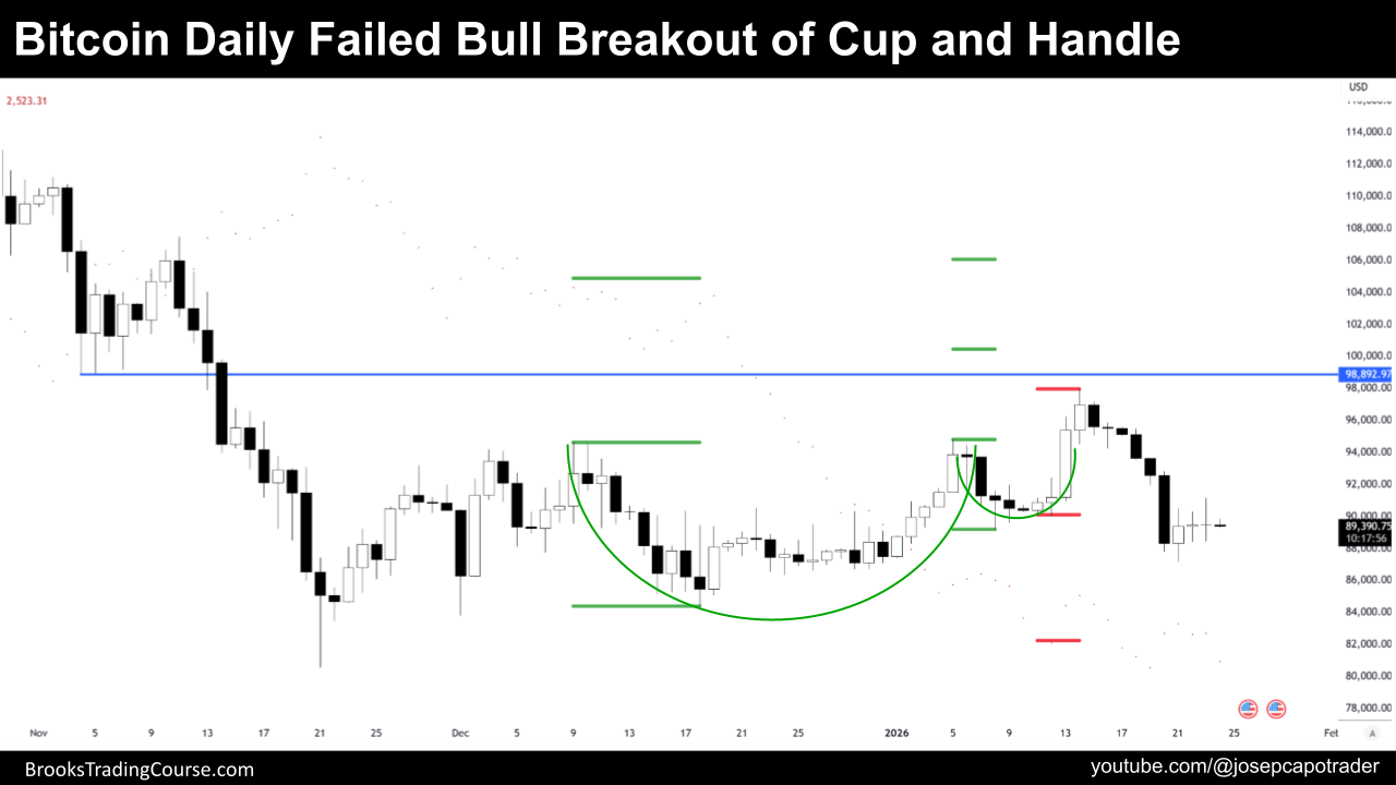 前几周,比特币从“杯柄形态”里突破,这是牛市中的经典延续信号。突破那根K线非常强,说明买盘积极。但紧跟着却是一根空头棒,对多头来说是一个警示:他们原本希望看到连续的上涨确认。回踩突破点: