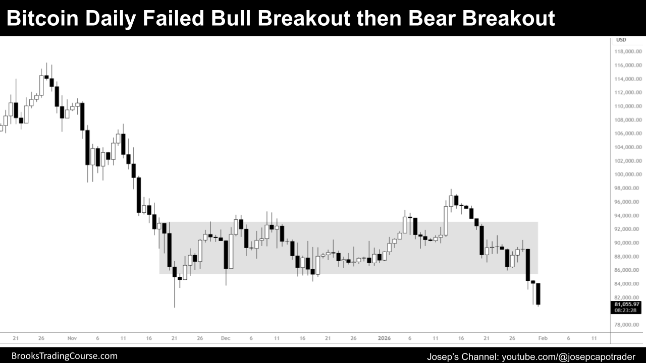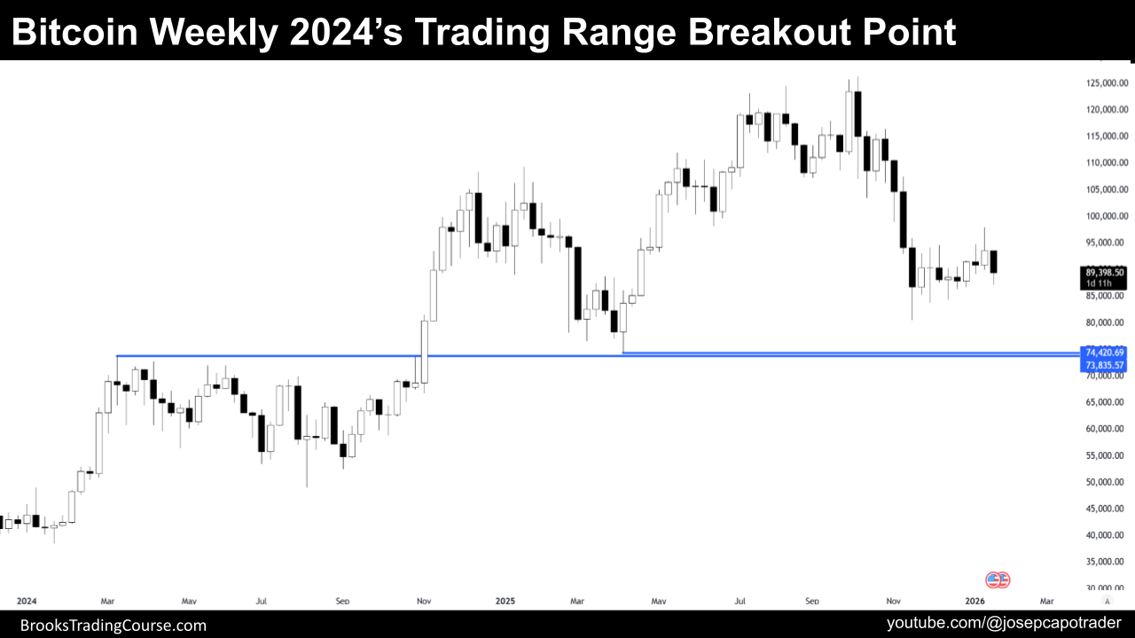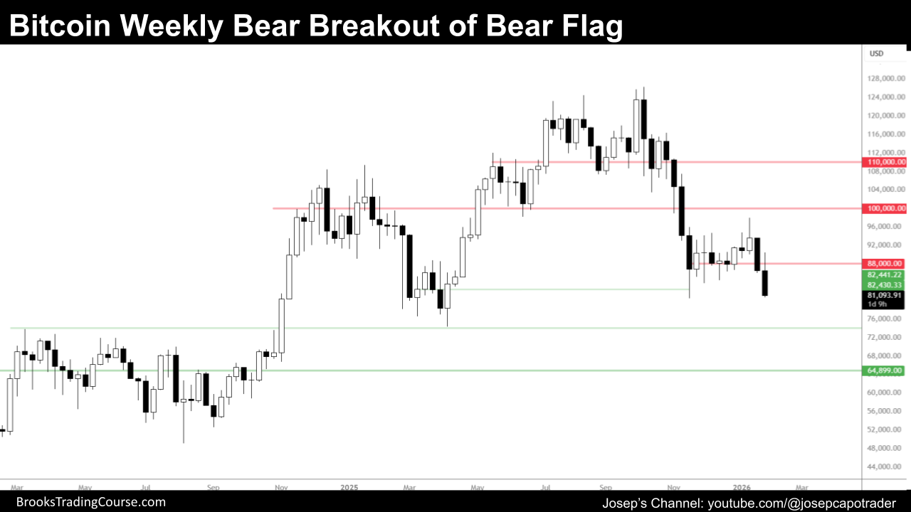 周线:空头突破增加下行压力,$100,000 是关键支撑。